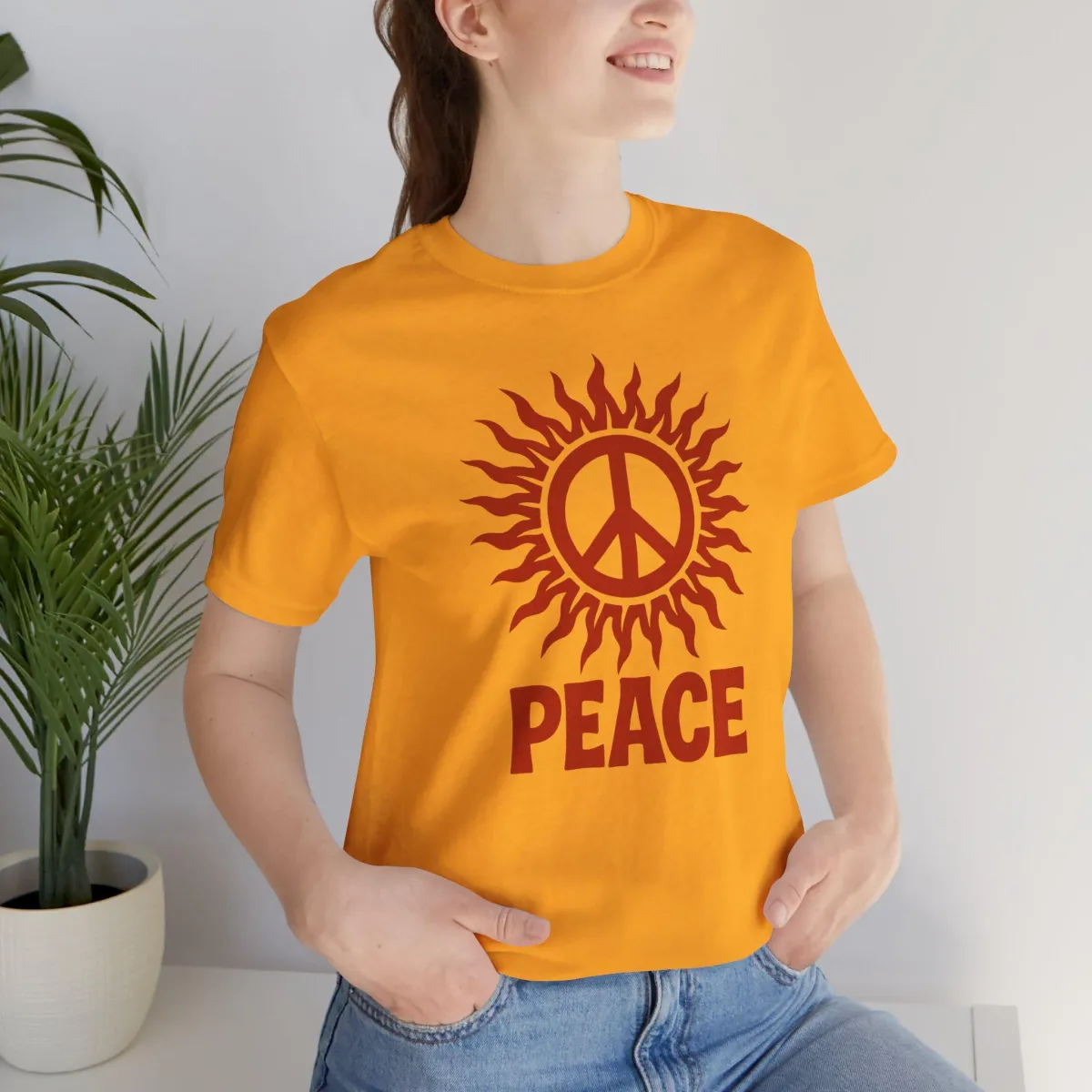 The Radiant Peace Sun T-Shirt brings bold style and timeless energy to your wardrobe with zero compromise. Its fiery sunburst peace symbol and bold lettering make it a powerful statement of unity, strength, and positivity. Designed for comfort and crafted with care, this shirt is perfect for festivals, activism marches, or just spreading good vibes wherever you go.