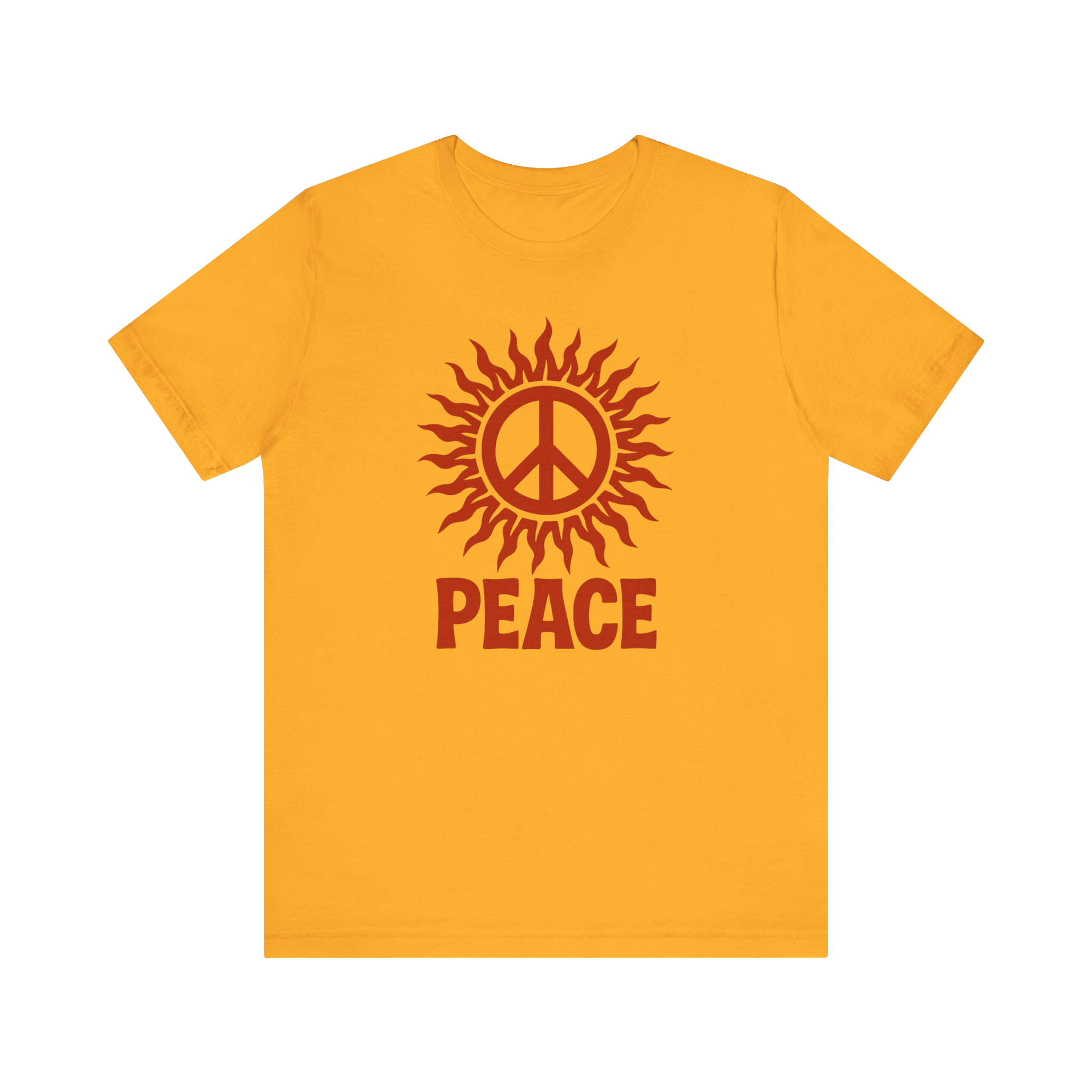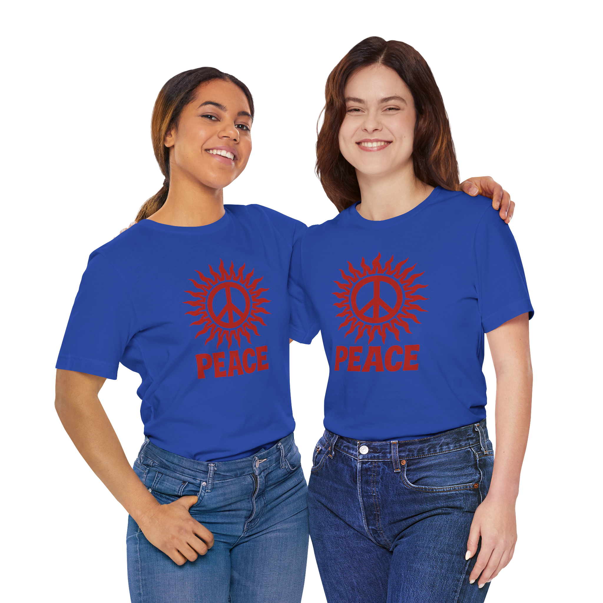 Shine bright and spread good energy with the Radiant Peace Sun T-Shirt — a bold red peace symbol surrounded by fiery sun rays.